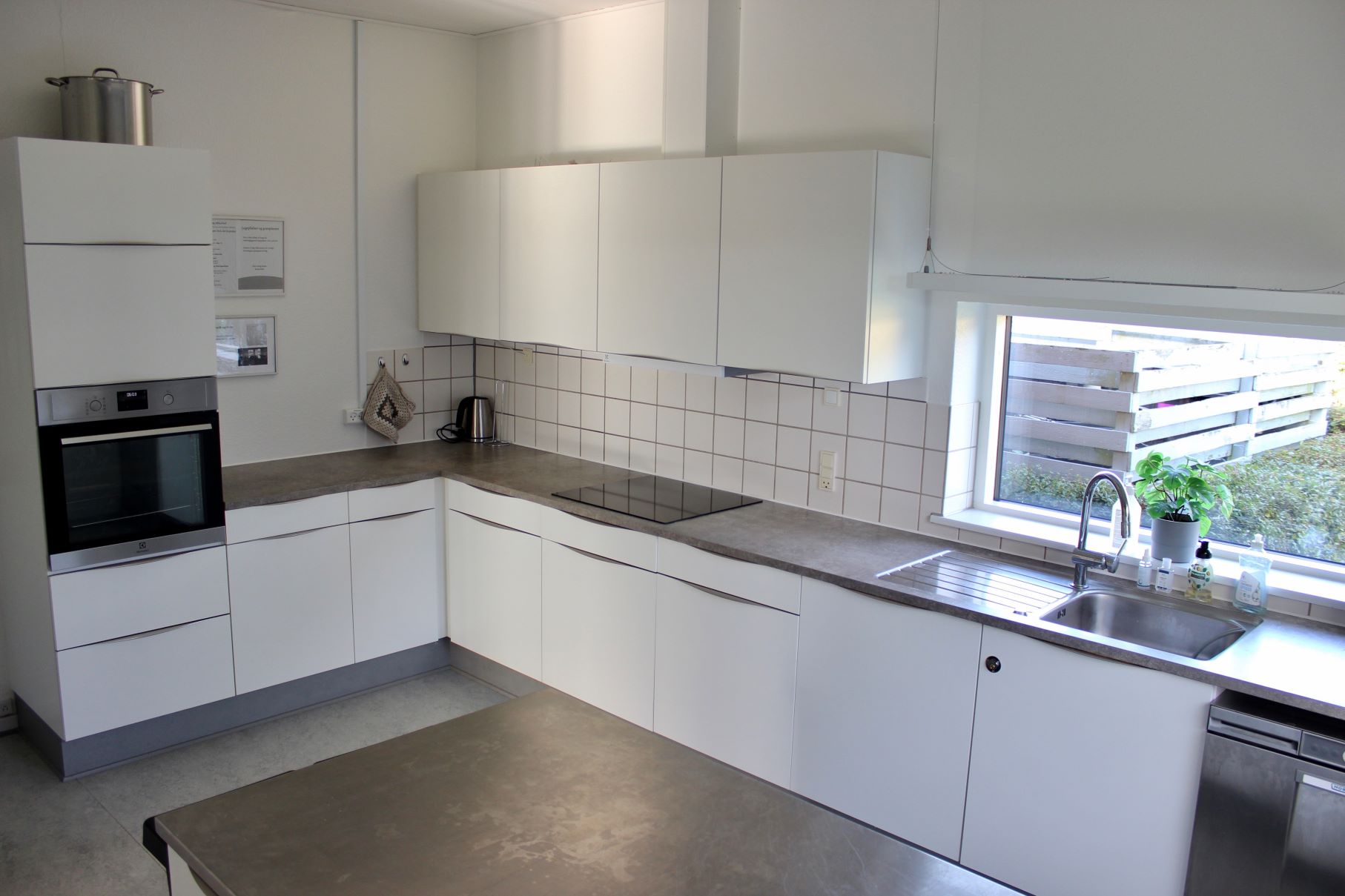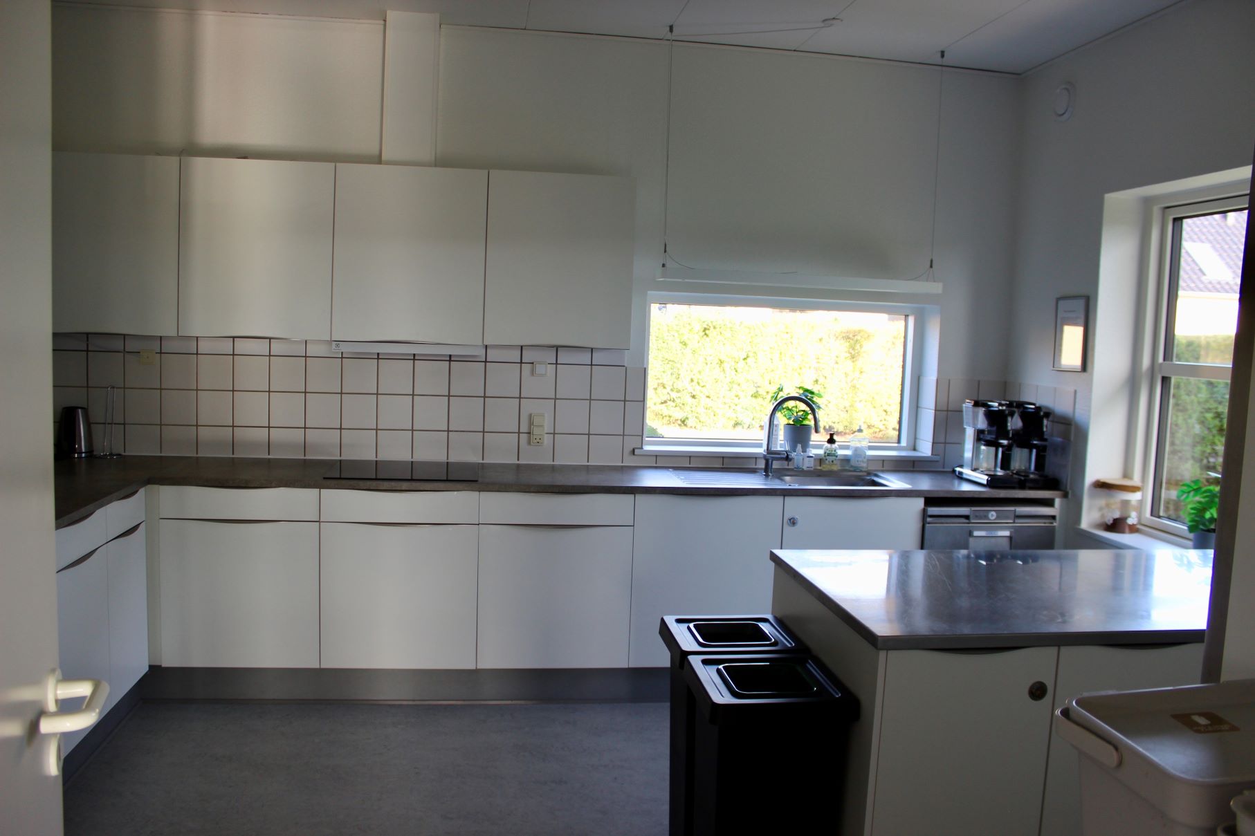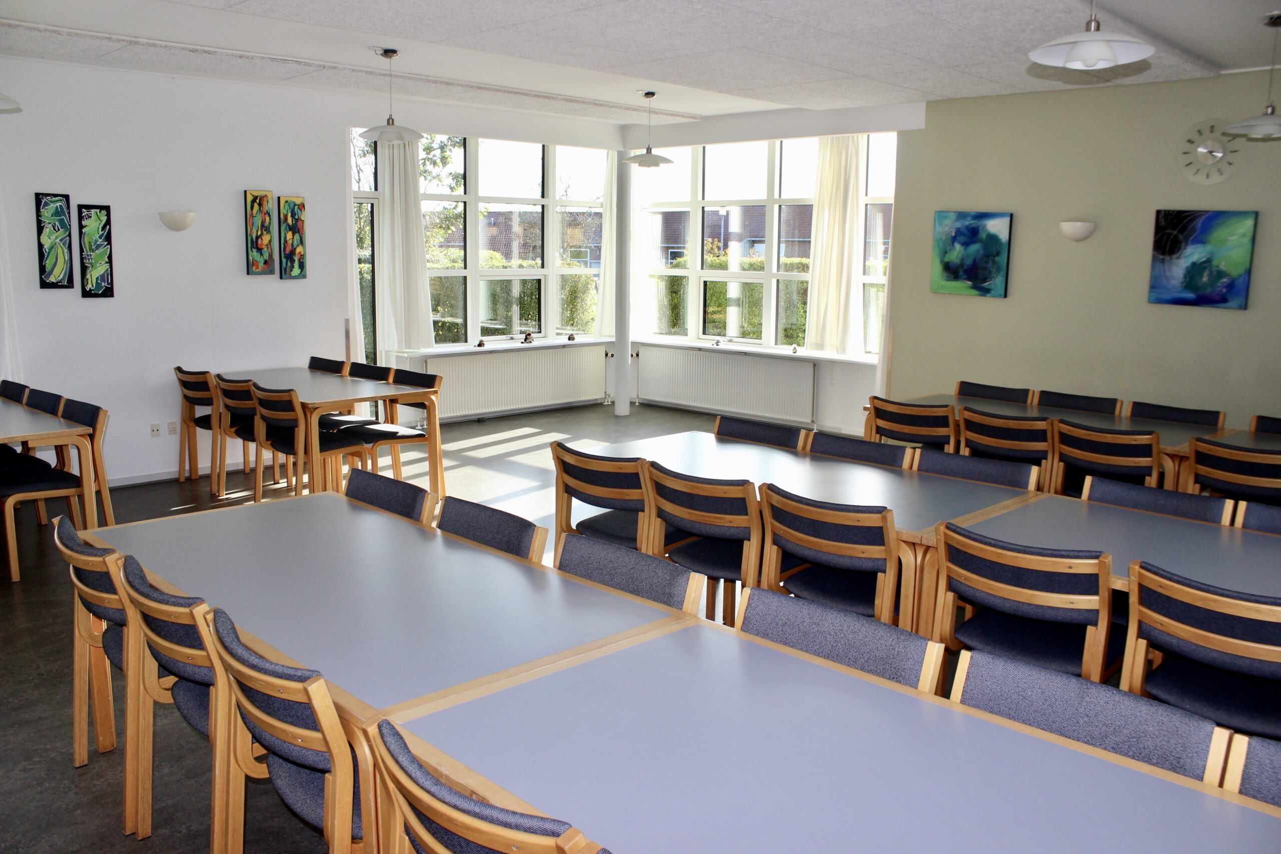 I hjørnet er der et stort vinduesparti med udsigt ud til foreningens græsplæne. Der er desuden en glasdør ud til en lille terrasse, der er omgivet af bukse.