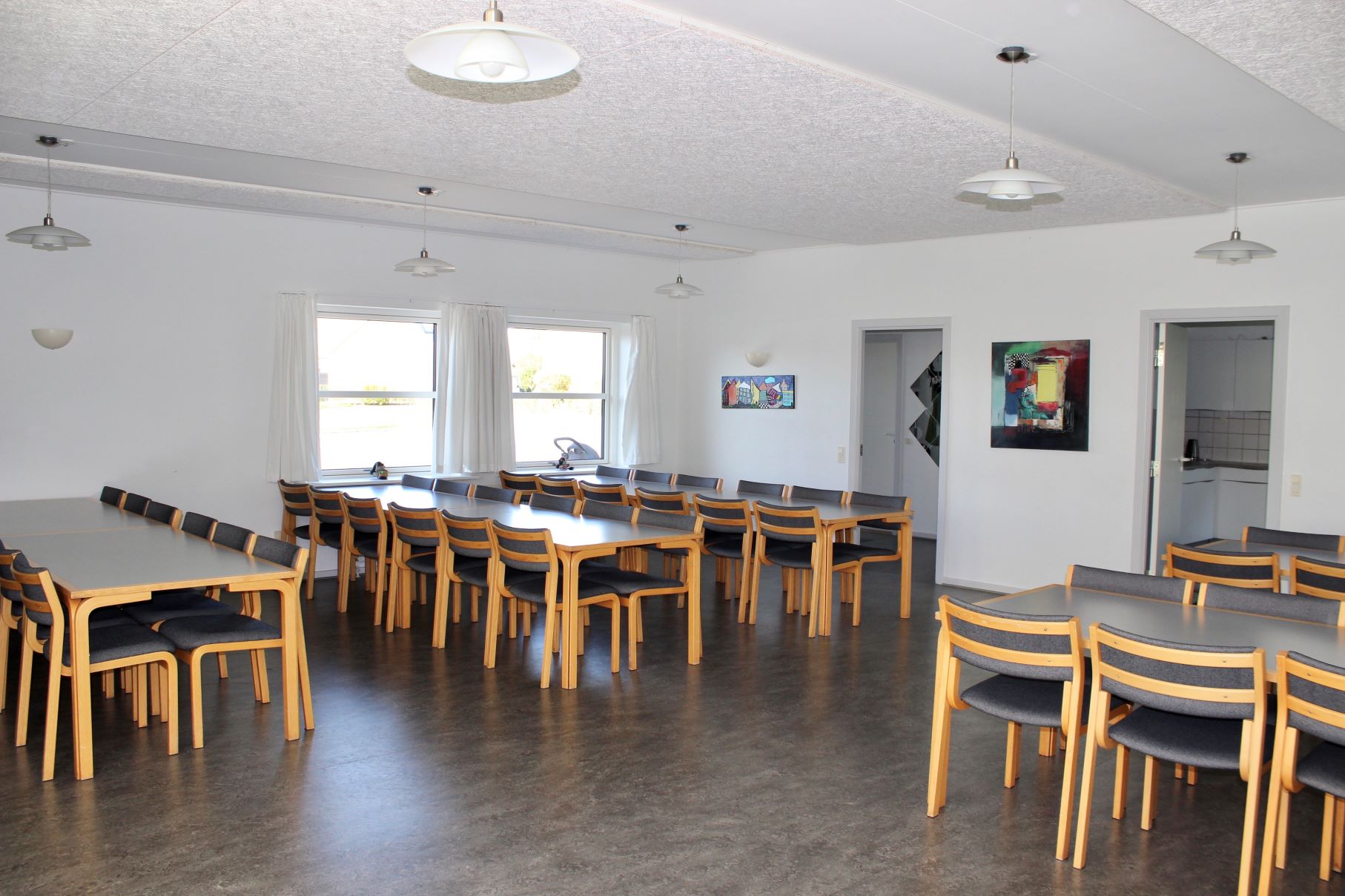 Forsamlingshuset har plads til 48 personer. Vi har borde og stole samt service til alle dine gæster.